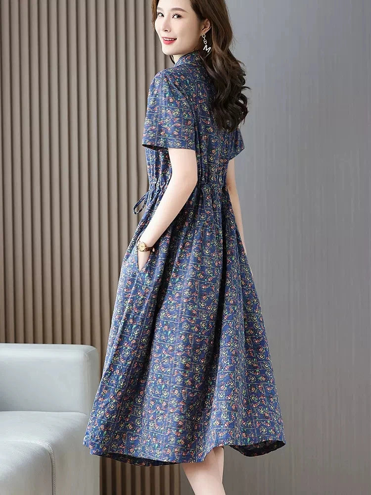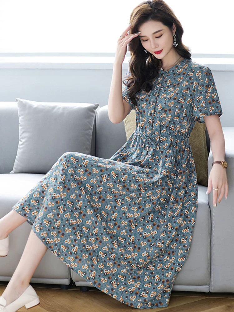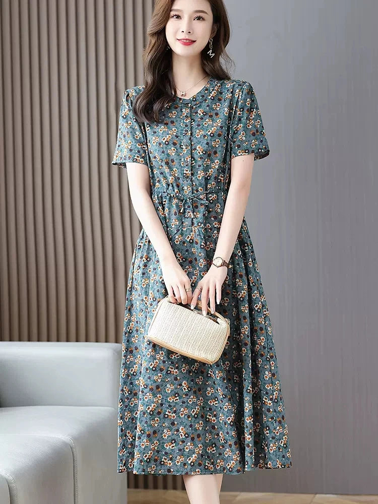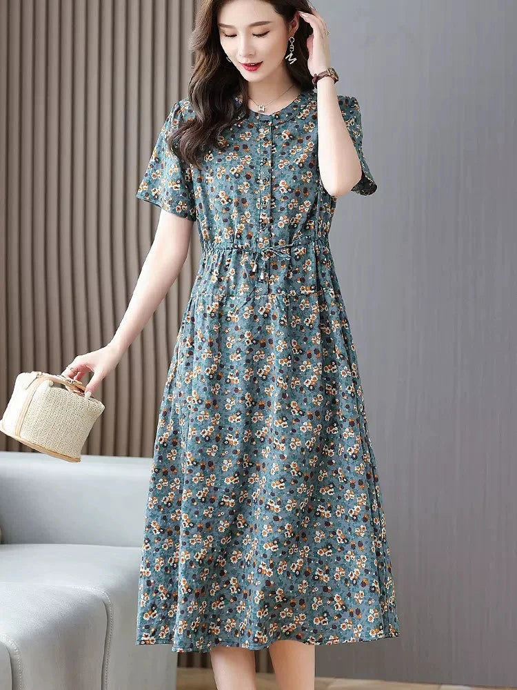 የጥጥ ቀሚሶች ሴቶች 2023 አዲስ በጋ የሚያምር የአበባ ህትመት ስዕል ገመድ ማክሲ ቀሚስ የተለመደ የላላ የእማማ ልብስ