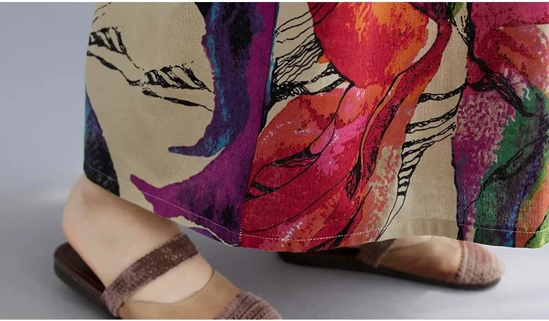 Boho Floral Cotton-Linen Summer Dress for Women – Ankle-Length, Loose Fit, O-Neck