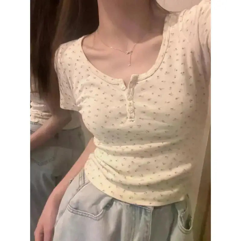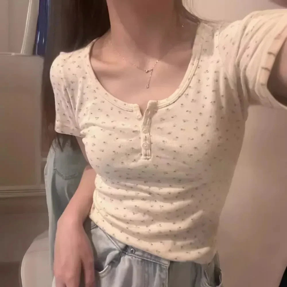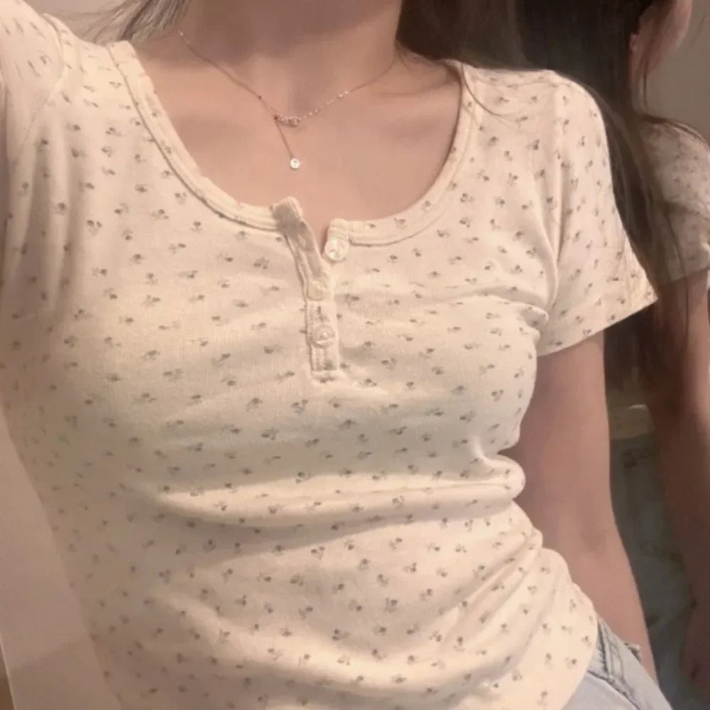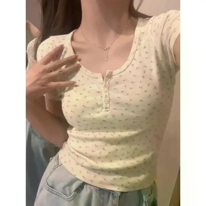 Dawndesslo Women's Slim Fit Square Collar Floral Button-Detail Tee