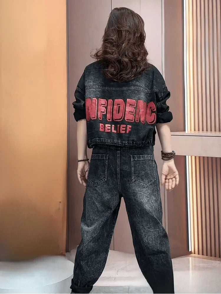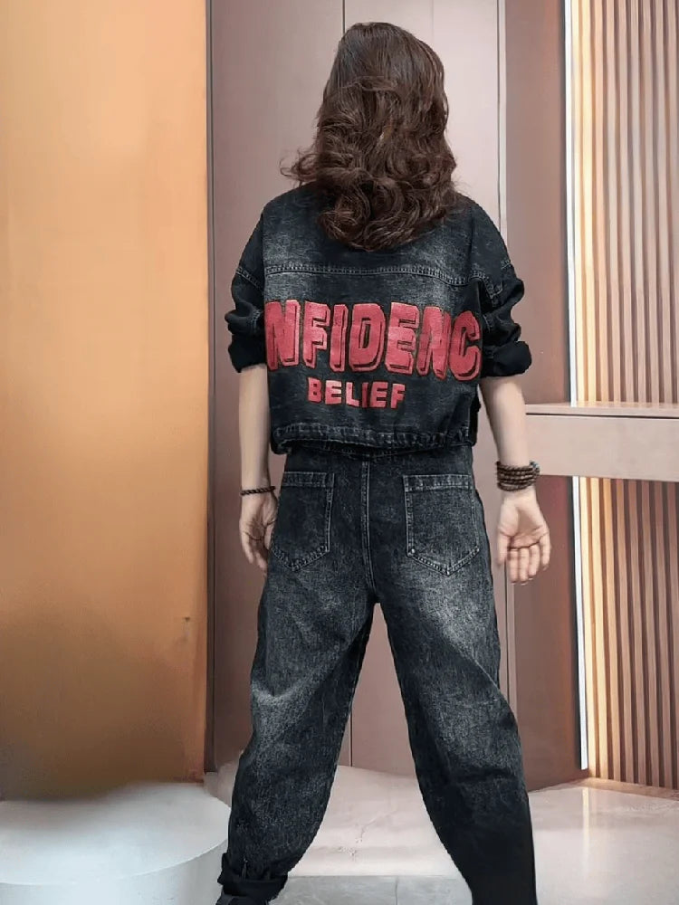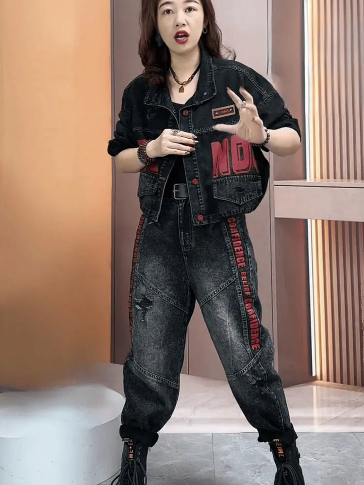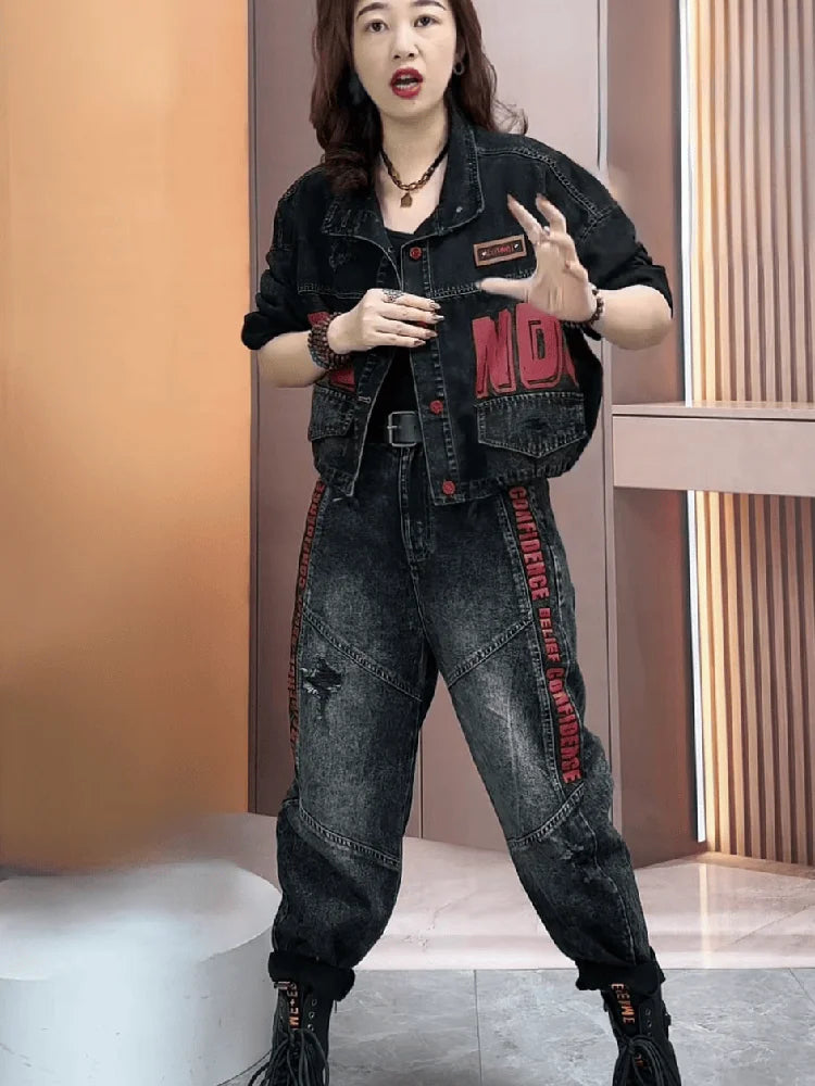 2024 Spring Autumn New Fashion Cool Personality Distressed Print Denim Set Women Loose Long Sleeved Jacket + Jeans