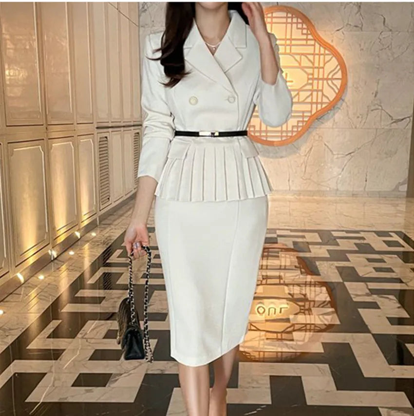 Autumn Spring Office Ladies Two Piece Set Double-Breasted White Ruffles Belt Blazer Tops + Split Pencil Skirt Suit