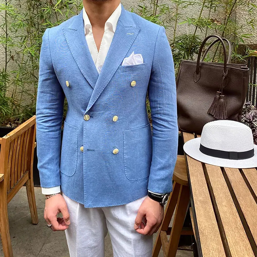 Casual Linen Double Breasted Peak Lapel Regular Length Slim Fit 2 Piece Jacket Pants Beach Tailor Full Set Chic Blazer for men
