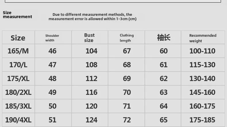 size: 165/M 170/L 175/XL 180/XXL 185/XXXL 190/XXXXL 195/5XL
