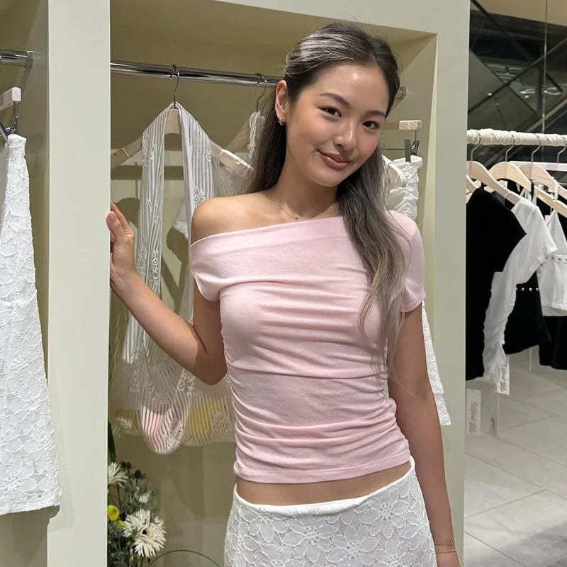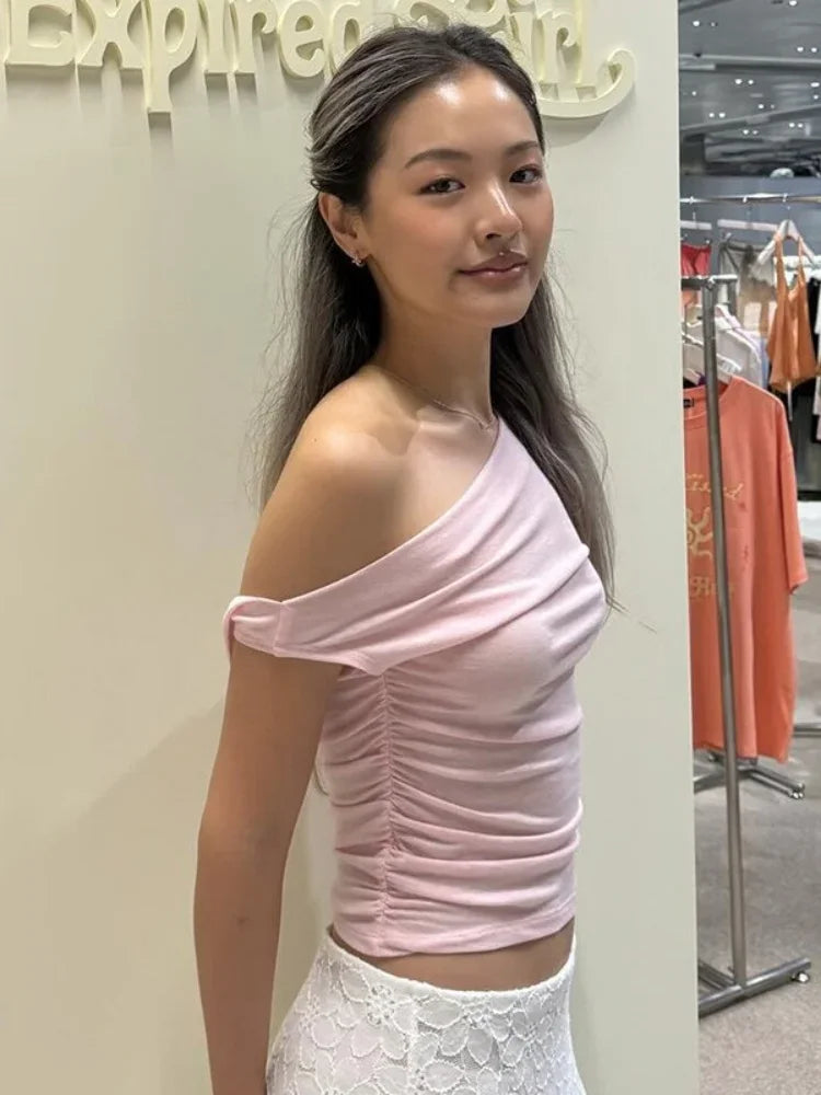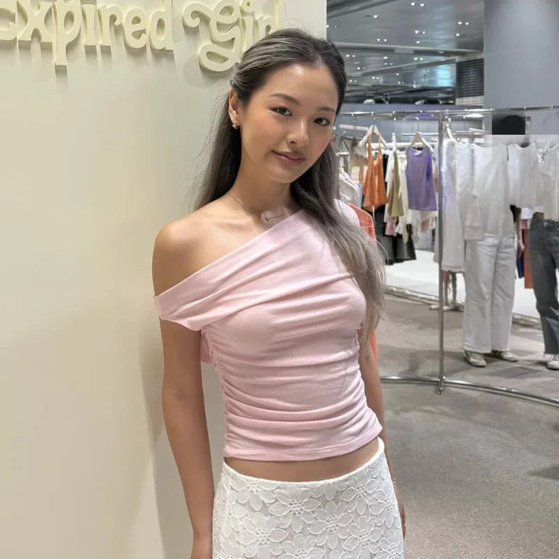 Vamos Todos Y2K Asymmetrical Skew Collar Slim Fit Tee for Women – Streetwear Summer Top