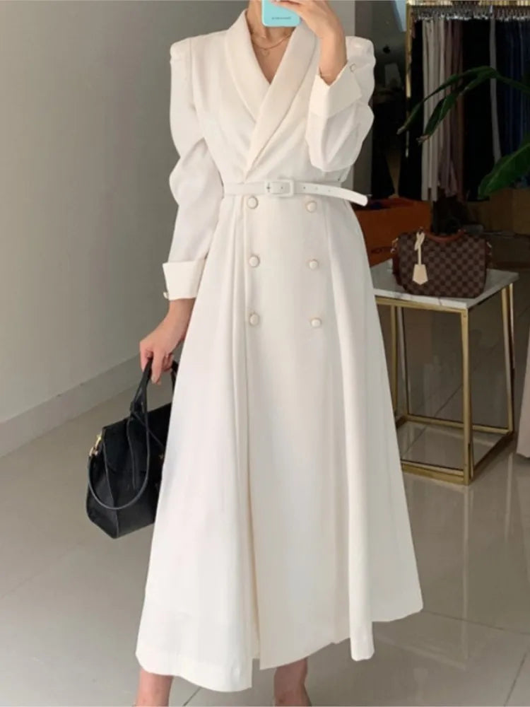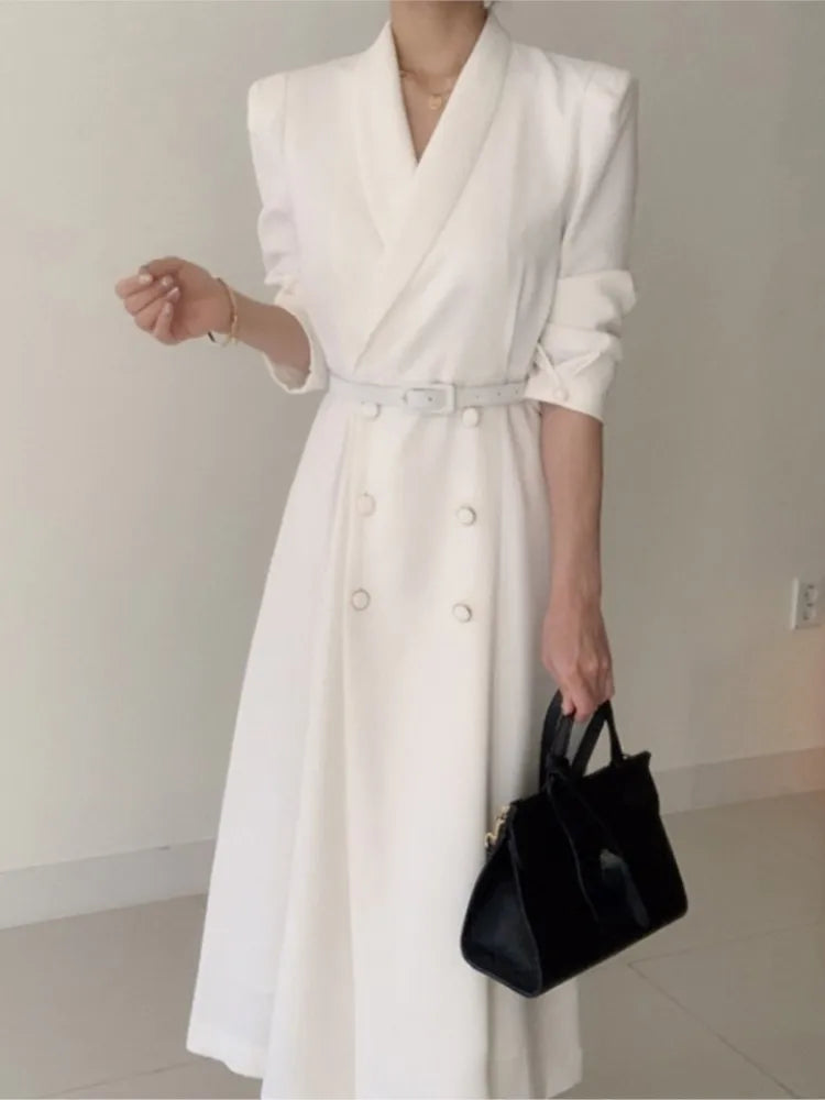 NoEnName Women's Office Lady A-Line Mid-Calf Dress – Double Breasted, Notched Neckline, and Sashes Decoration